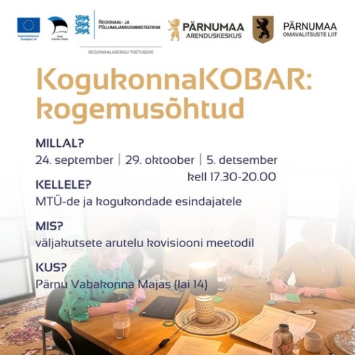 Kutsume Pärnumaa MTÜ-de ja kogukondade esindajaid arutama oma väljakutseid ja leidma uusi lahendusi kovisiooni meetodil. See on võimalus jagada kogemusi, saada värskeid vaatenurki ja tuge teistelt tegijatelt.