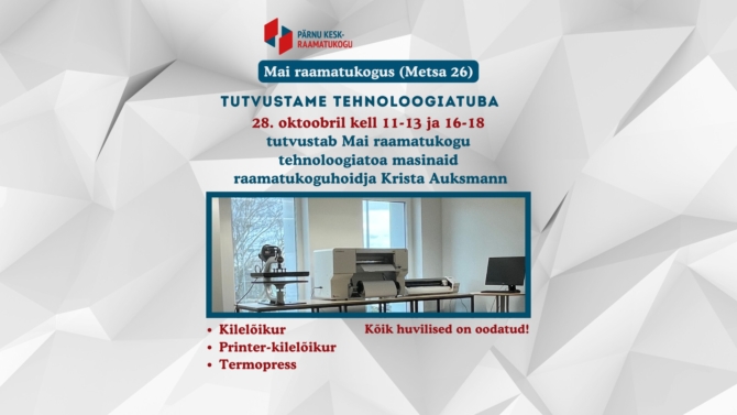 - oktoobril kell 11–13 ja 16–18 tutvustab Pärnu Mai haruraamatukogus (Metsa tn 26) raamatukoguhoidja Krista Auksmann tehnoloogiatoa seadmeid – kilelõikurit ja termopressi.