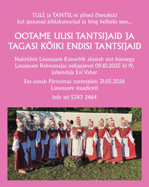 Lavassaare naisrahvatantsurühm Kanarbik ootab uusi ja ja tagasi endisi tantsijaid trennidega alustama 9.oktoobril 2025 kell 19.00 Lavassaare Rahvamajas. Juhendaja Evi Vaher