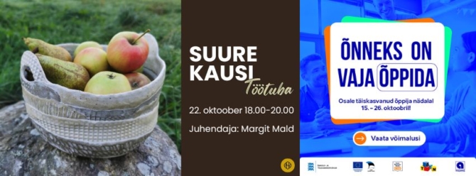 Oktoobri pimedal ja jahedal sügisõhtul, on hea aeg teha veidike näputööd ja valmistada endale Haapsalu Kunstikooli töötoas ÜKS SUUREM KAUSS, kuhu panna kõik kodused õunad ja mandariinid või segada kokku üks suurem ports tervislikku salatit. Töötuppa on oodatud kõik, kellele meeldib savist käsitsi vormimine. Tempo rahulik ja meditatiivne!