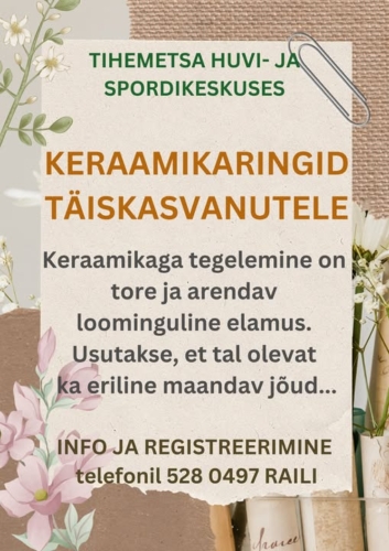Keraamikaringid täiskasvanutele toimuvad esmaspäeviti Tihemetsa Huvi- ja Spordikeskuses.