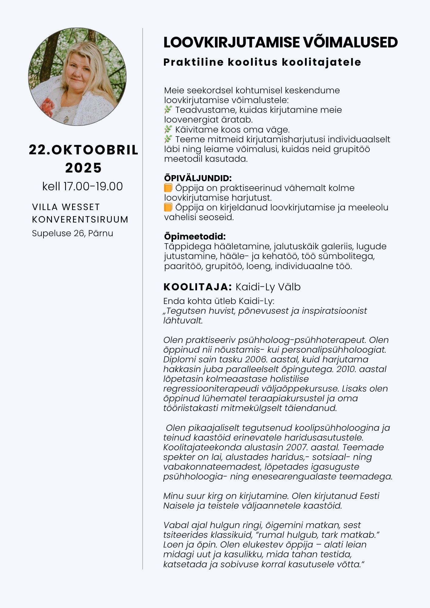 22.oktoobril kell 17.00-19.00 toimub koolitajatele koolitus “Loovkirjutamise võimalused”