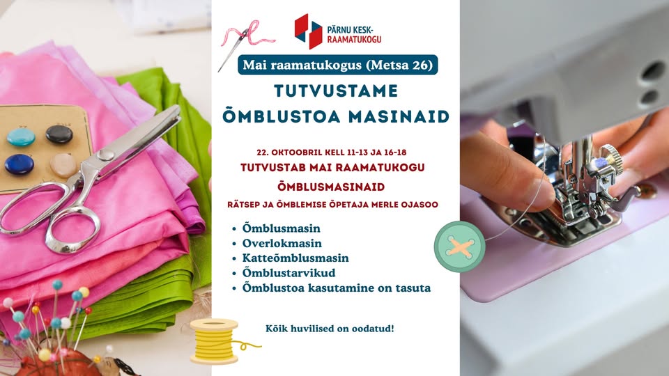 Kolmapäeval, 22. oktoobril kell 11–13 ja kell 16–18 tutvustab Mai haruraamatukogu (Metsa tn 26) õmblustoa masinaid rätsep ja õmblemisõpetaja Merle Ojasoo.