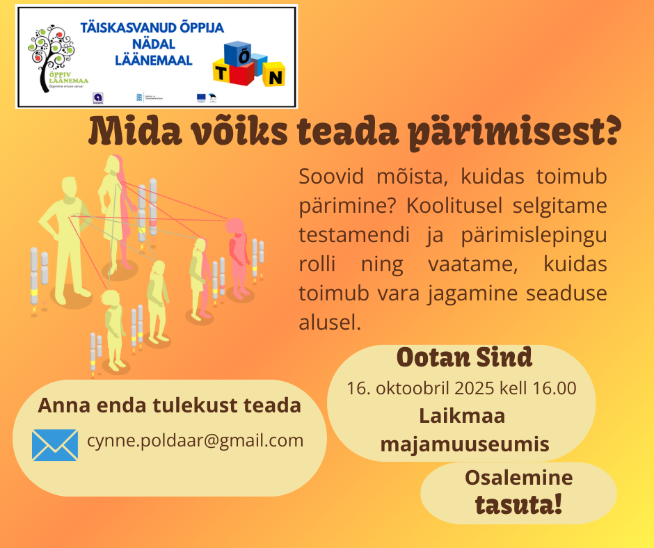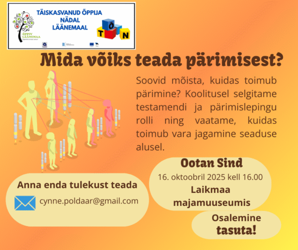 Koolitusel selgitame testamendi ja pärimislepingu rolli ning vaatame kuidas toimub vara jagamine seaduse alusel.