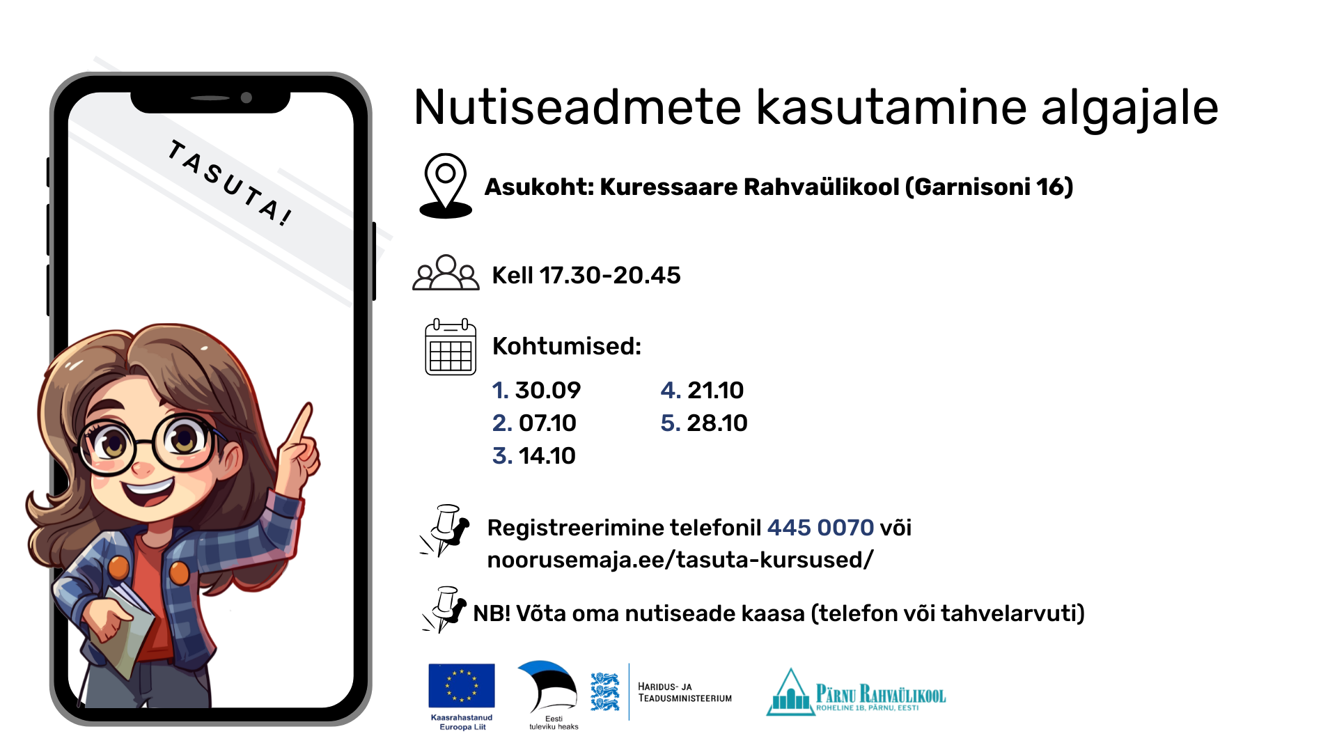 Lisainfo ja registreerimine: https://www.noorusemaja.ee/nutiseadmete-kasutamine-algajale-kuressaares/